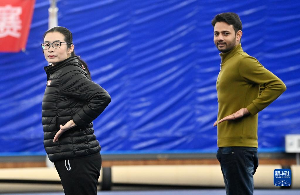 在天津市西青區精武鎮精武會館,穆罕默德·納比爾(右)和霍靜虹一起練習“霍氏練手拳”(12月25日攝)。