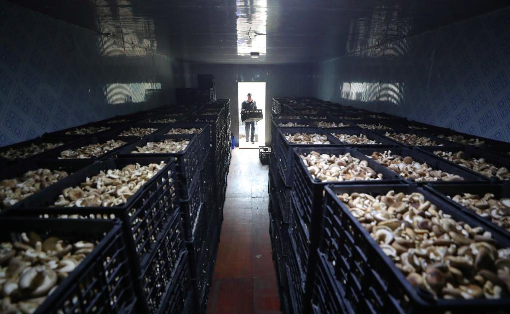 12月27日,在衡東縣三樟鎮(zhèn)義門村,村民將采摘的香菇裝進(jìn)冷庫存放。