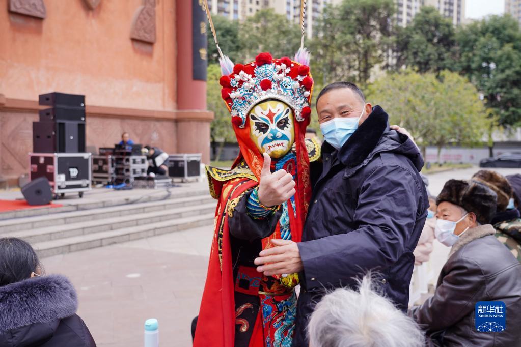 12月27日,在眉山市彭山區(qū)觀音街道龍門橋社區(qū),演員與觀眾互動。