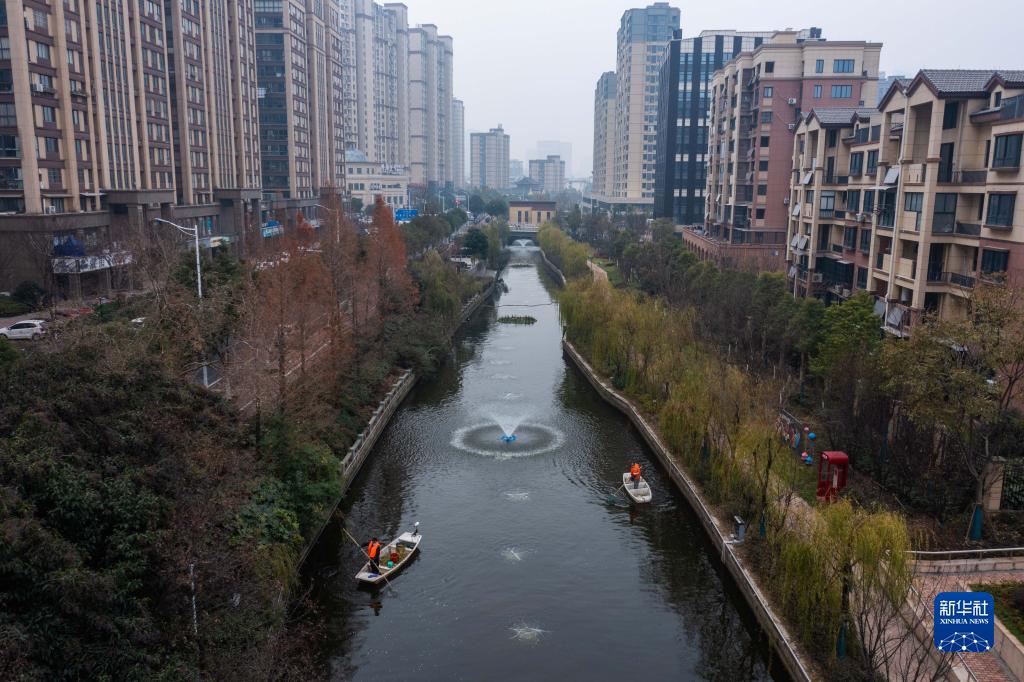 12月28日,龍泉街道的保潔人員在市陌河上清理漂浮物(無人機照片)。