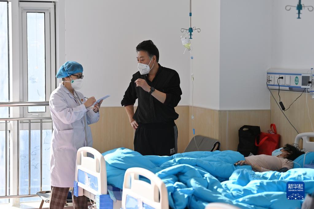 12月28日,醫護人員在天津市西青醫院發熱門診擴展區向家屬詢問患者情況。