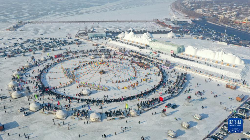 12月28日,在查干湖第二十一屆冬捕節現場,游客觀看祭湖醒網儀式(無人機照片)。