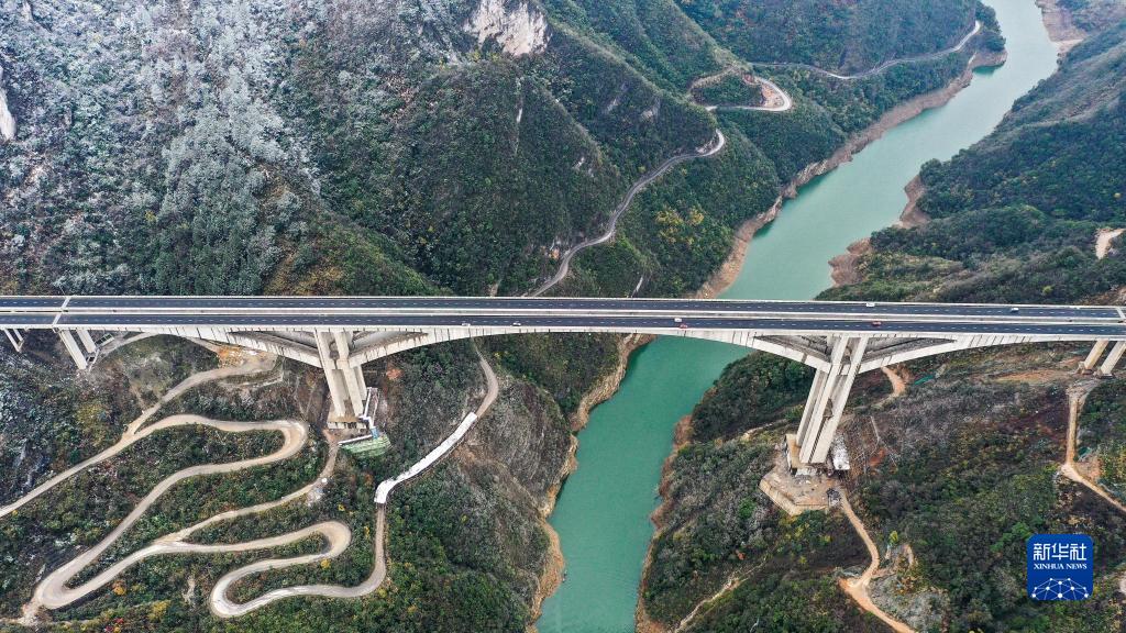 12月28日,車輛從貴陽至黃平高速公路貴定互通連接線甘溪特大橋上通過(無人機照片)。
