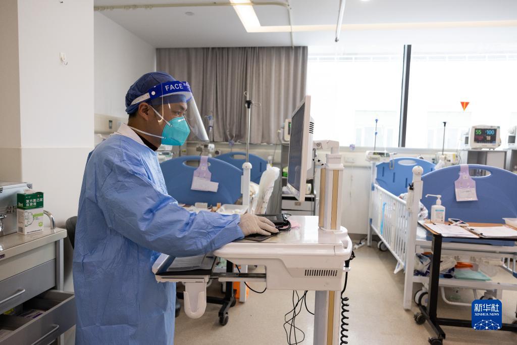 12月27日,在上海交通大學(xué)醫(yī)學(xué)院附屬新華醫(yī)院兒童急診ICU陽(yáng)性病區(qū),醫(yī)生在輸入病例信息。