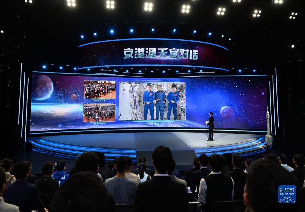 1月1日拍攝的“元旦京港澳天宮對話”活動北京主會場。活動采取天地連線、多地協同形式進行,由中央廣播電視總臺進行全程現場直播。航天專家和在天宮空間站的航天員與來自北京、香港和澳門的青年學子展開互動交流。 新華社記者 金良快 攝