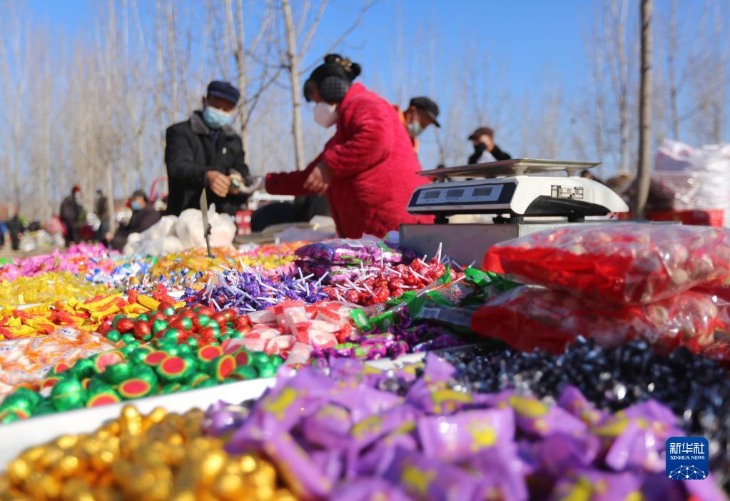12月28日,在山東省臨沂市沂南縣岸堤鎮(zhèn),人們在大集上購買糖果。