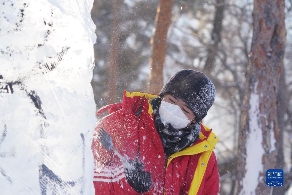 12月29日,參賽選手在進行冰雕創作。