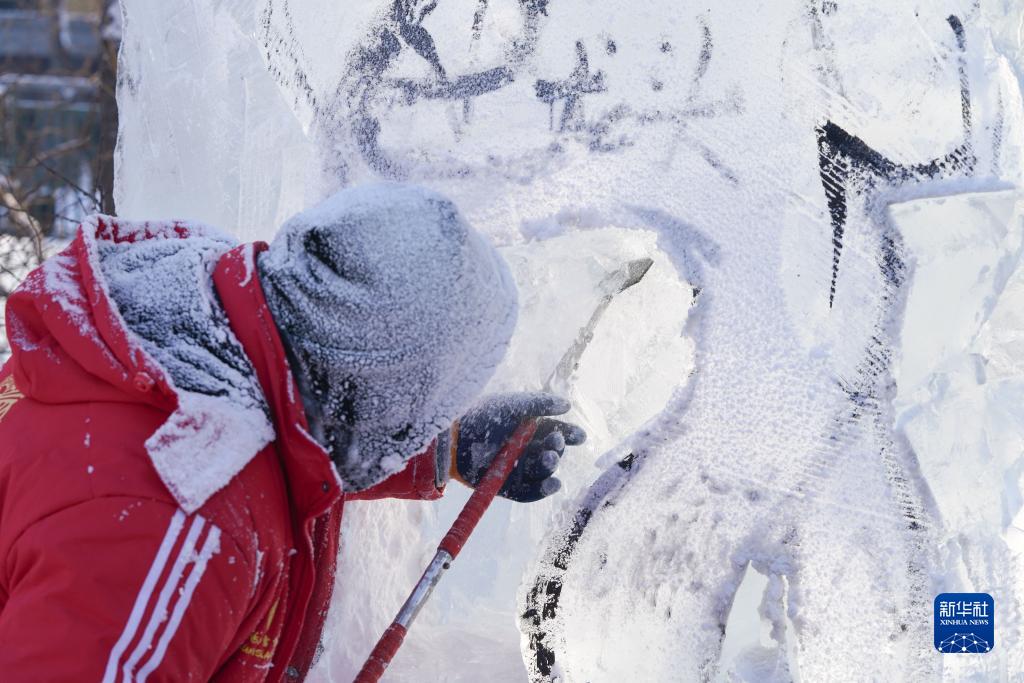 12月29日,參賽選手在進行冰雕創作。