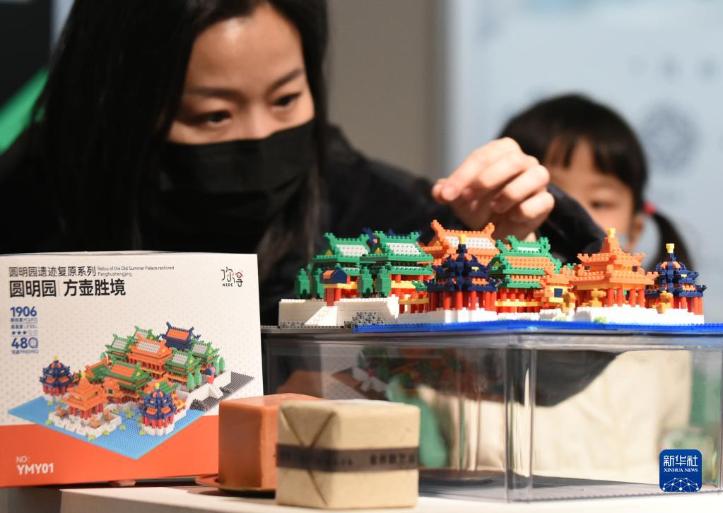 12月29日,工作人員在調整一件用微顆粒積木拼接的圓明園景觀模型。