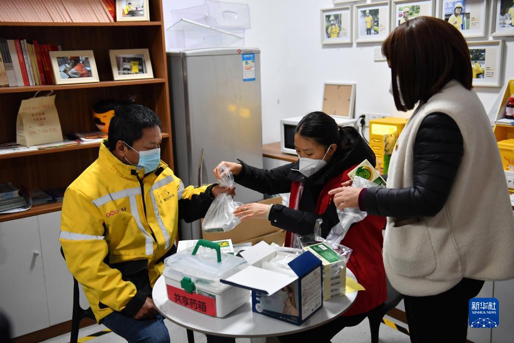 12月29日,在長沙市天心區文源街道天鴻社區的“紅色之家”,外賣騎手領取藥品。