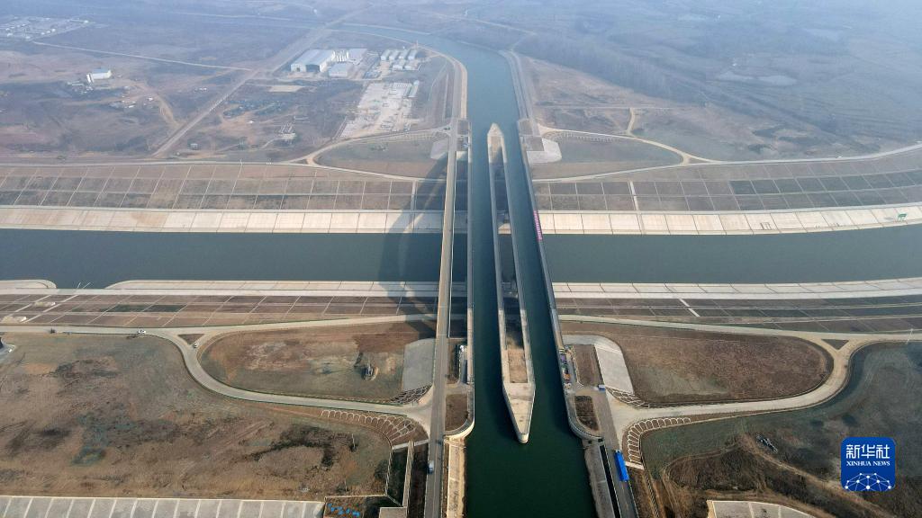 12月30日,中鐵四局參建的引江濟淮淠河總干渠渡槽通航(無人機照片)。淠河總干渠從引江濟淮運河上凌空而過,呈現出河上有河的“水上立交”景象。
