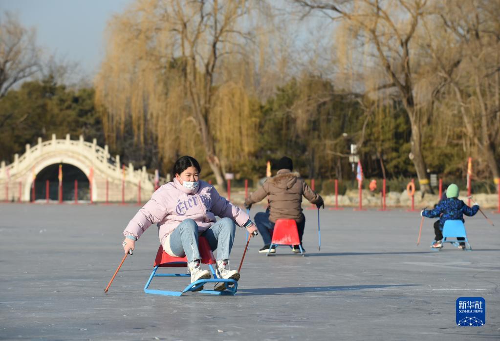 12月31日,游客在圓明園冰場滑冰車。