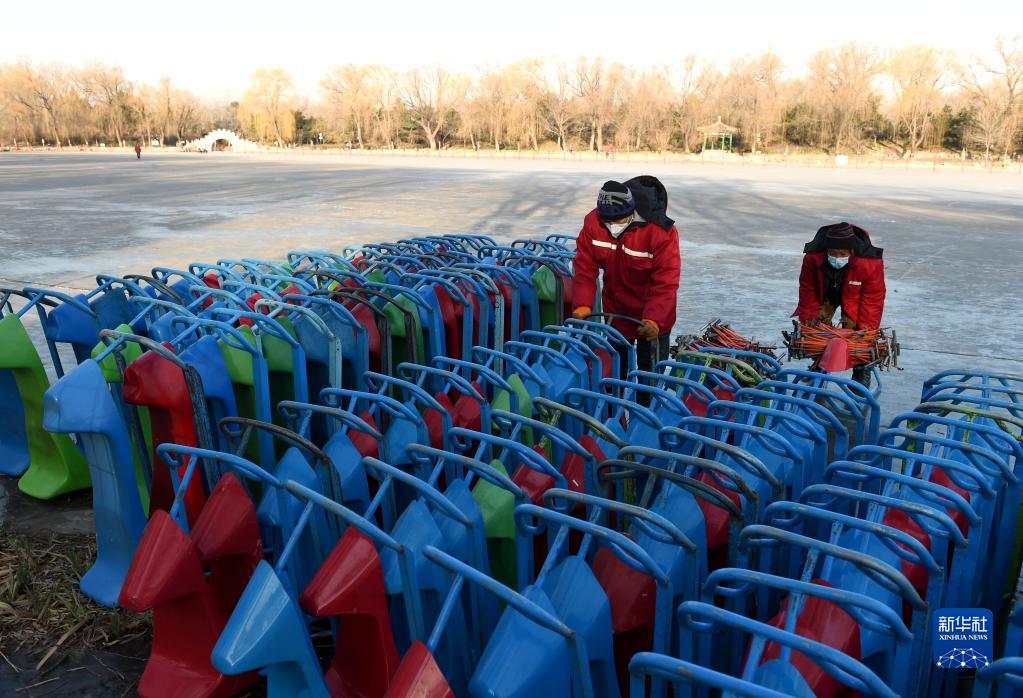12月31日,圓明園冰場(chǎng)的工作人員在整理冰車(chē)。