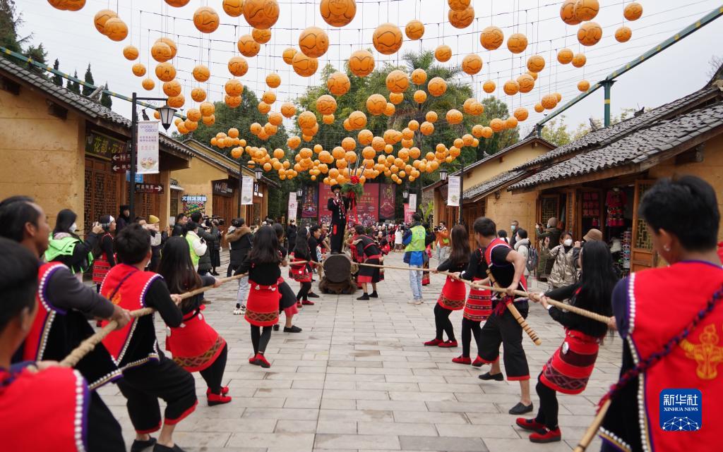 2022年12月31日,在云南省昆明市云南民族村內,游客與佤族演員一起體驗拉木鼓。
