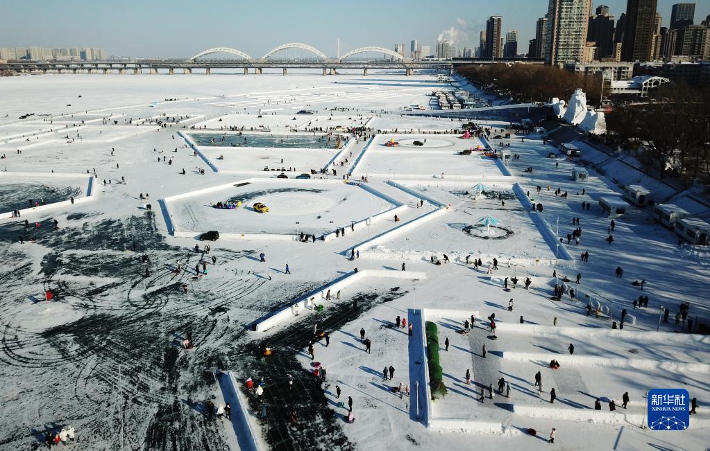 1月1日,游客在黑龍江省哈爾濱松花江冰雪嘉年華園區(qū)游玩(無(wú)人機(jī)照片)。