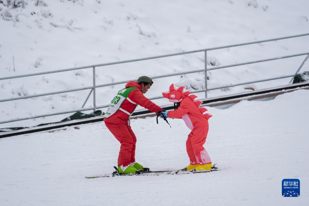 1月1日,在重慶市南川區(qū)金佛山景區(qū)滑雪場,一名游客(右)在雪場教練的指導(dǎo)下學(xué)習(xí)滑雪。