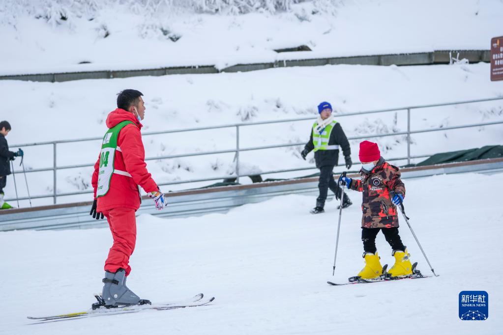 1月1日,在重慶市南川區金佛山景區滑雪場,一名小朋友在雪場教練的指導下練習滑雪。