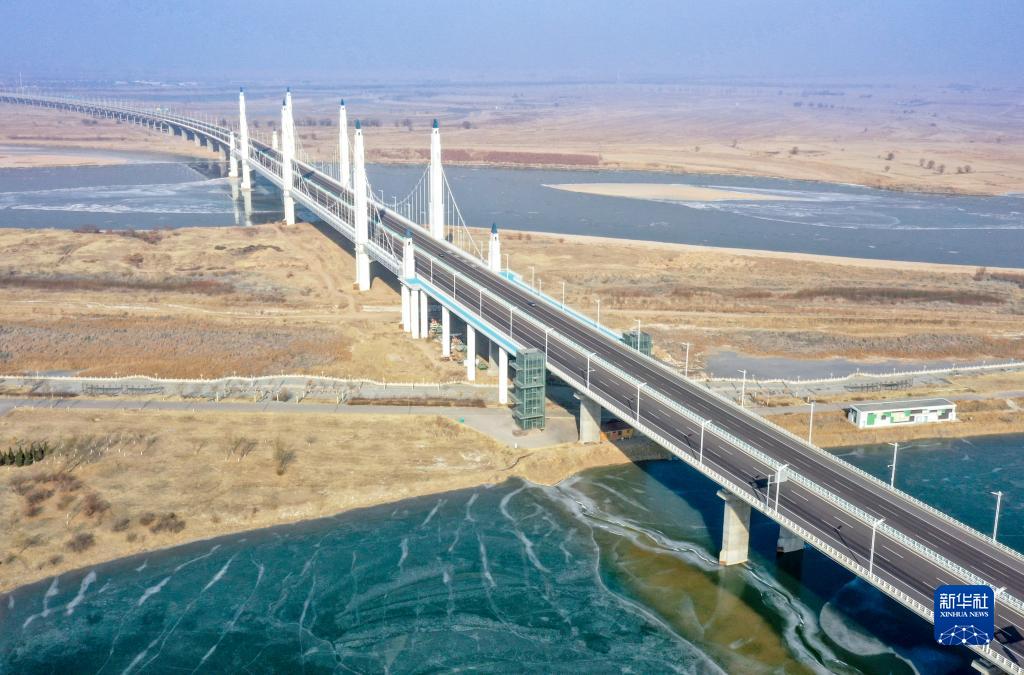 這是2023年1月2日拍攝的寧夏銀川市濱河黃河大橋(無人機照片)。