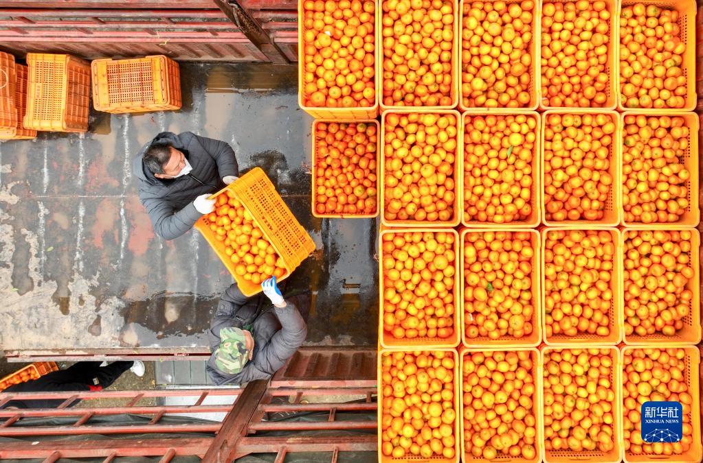 1月3日,在湖南省永州市道縣清塘鎮尹家村真秀農業果園基地,農民在裝運柑橘(無人機照片)。