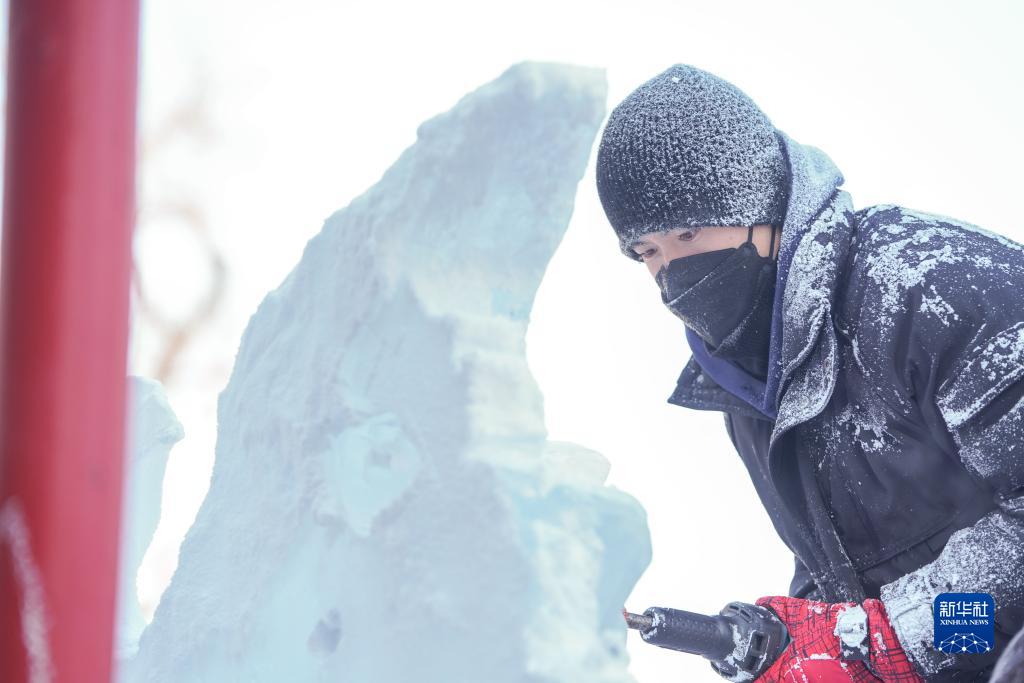 1月4日,在哈爾濱冰燈藝術游園會園區,冰雕師在進行冰雕藝術作品創作。