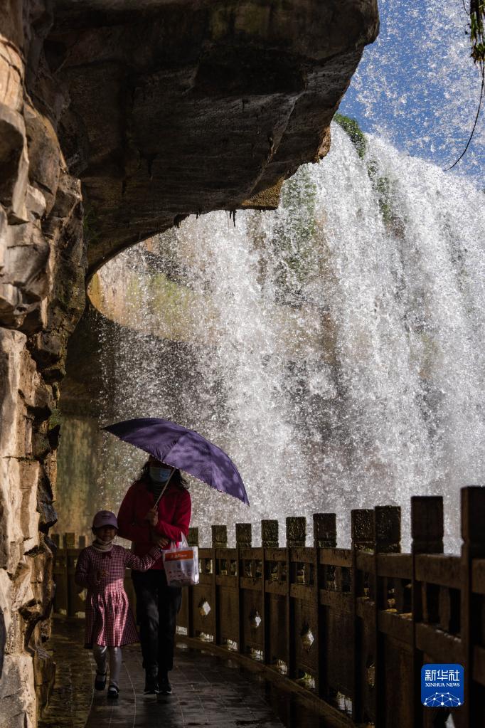 當日,云南昆明天氣晴好,游客來到位于昆明北部山水新區的昆明瀑布公園參觀游覽。公園內的人工瀑布落差約12.5米,寬幅約400米。