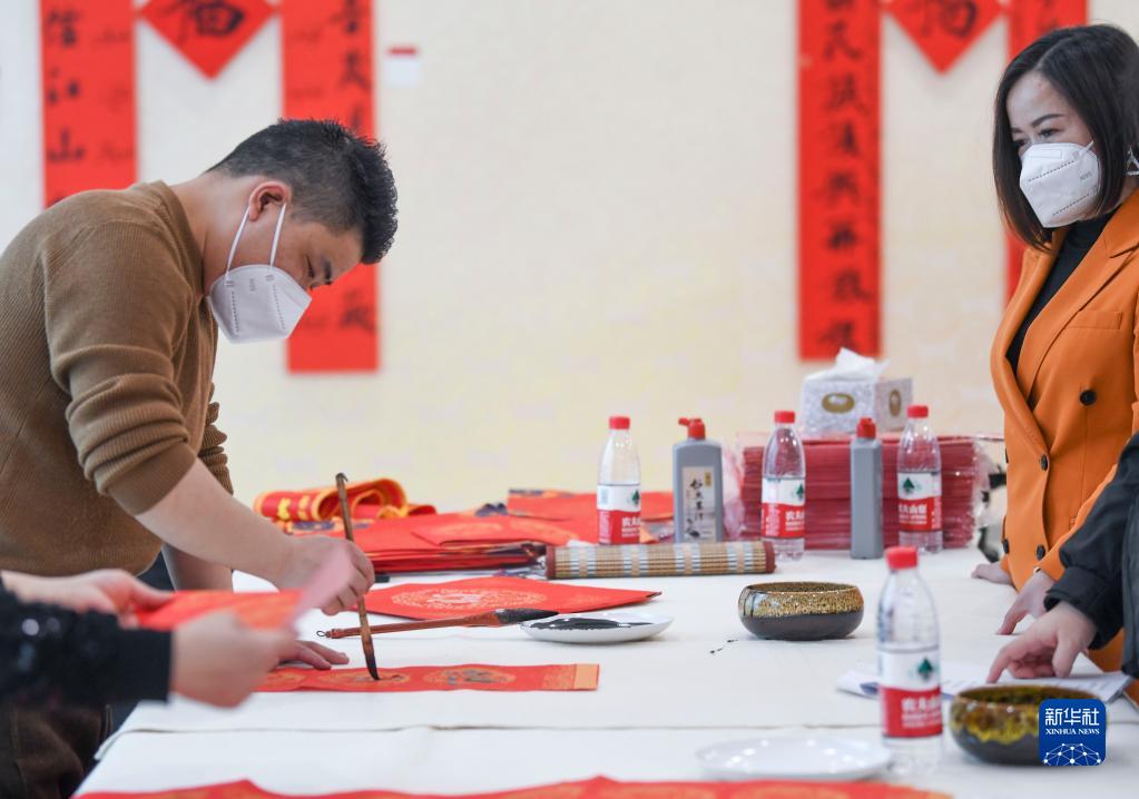 1月4日,在新疆圖書館主會場內,書法家(左)為市民寫春聯。