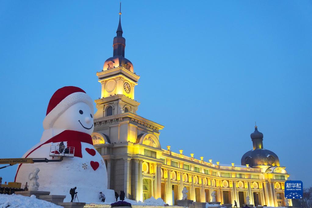 1月4日,在哈爾濱松花江畔,工人進行大雪人收尾工作。