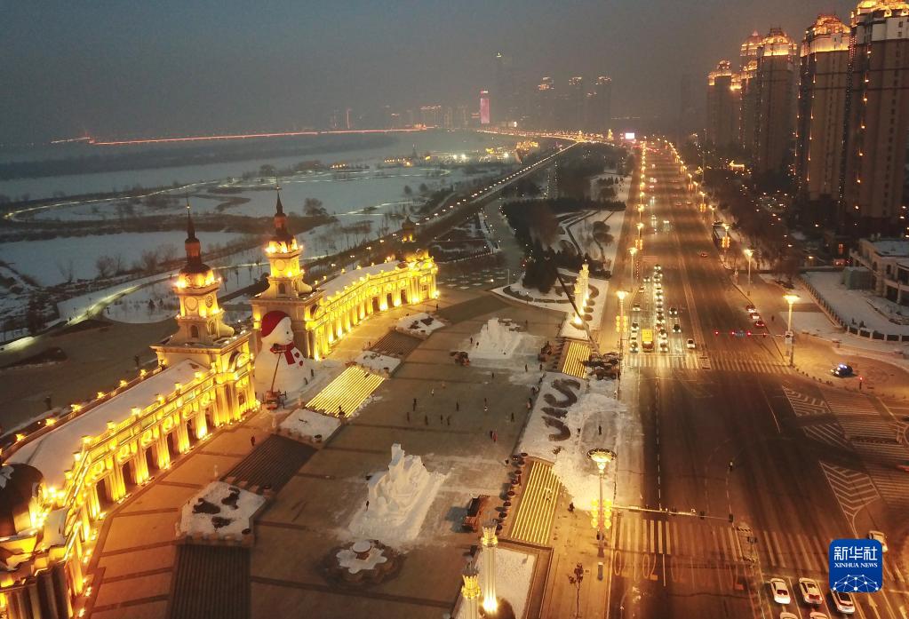 1月4日,在哈爾濱松花江畔,工人進行大雪人收尾工作(無人機照片)。