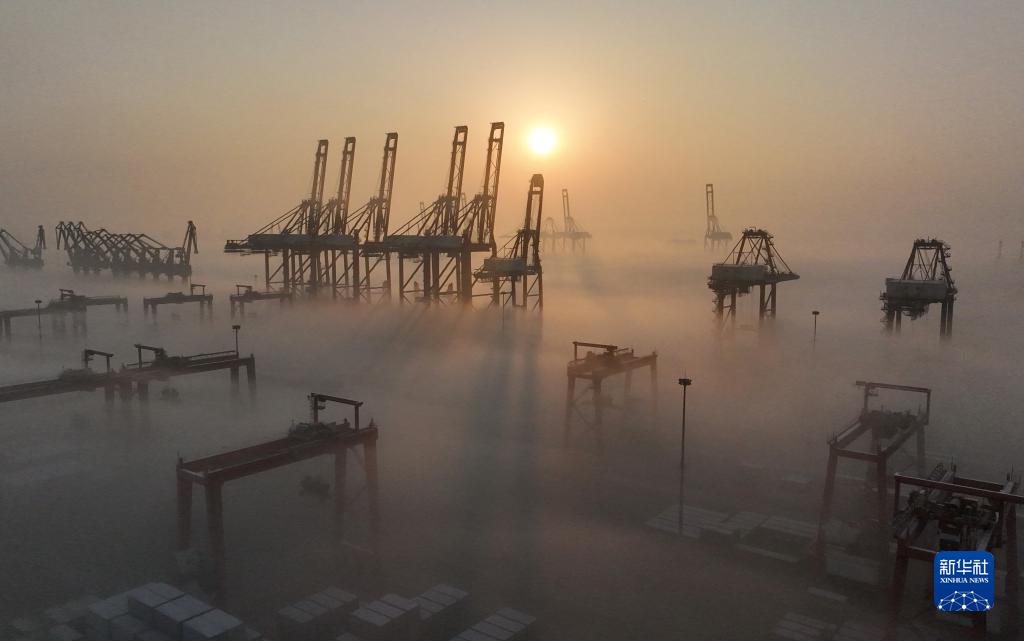 平流霧中的唐山港京唐港區景色(1月5日攝,無人機照片)。