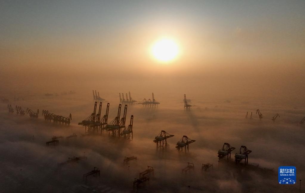 平流霧中的唐山港京唐港區(qū)景色(1月5日攝,無人機照片)。