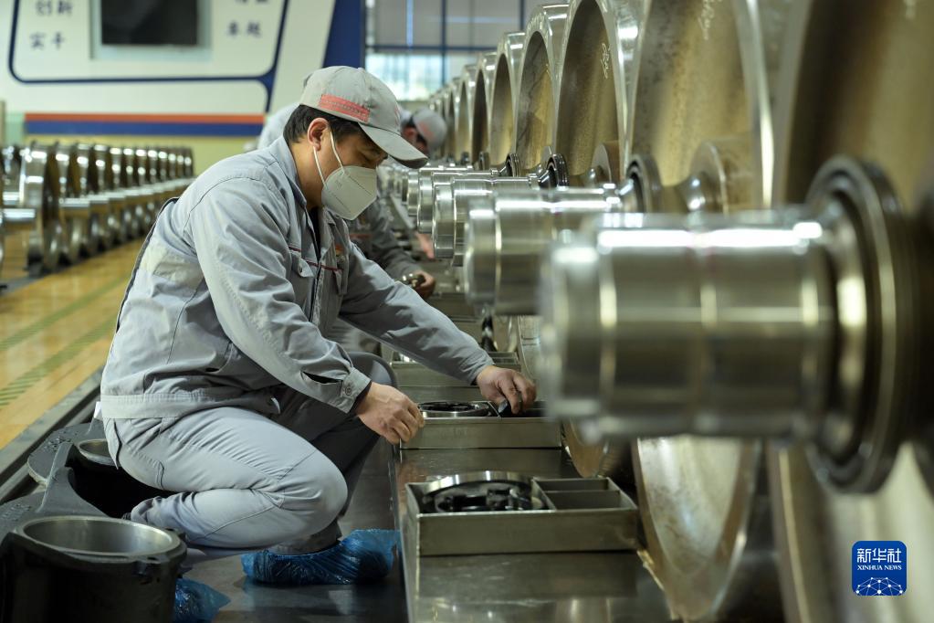 1月4日,在中國鐵路上海局集團有限公司合肥車輛段合肥客車整備場,工作人員對旅客列車車輪進行整修。