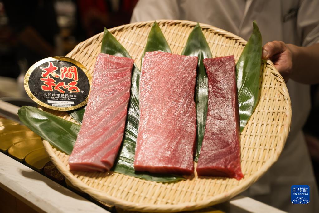 1月5日,廚師在日本東京表參道一家餐館向媒體展示最高價金槍魚的魚肉。
