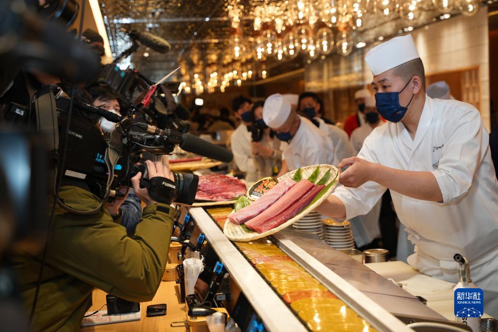 1月5日,廚師在日本東京表參道一家餐館向媒體展示最高價金槍魚的魚肉。
