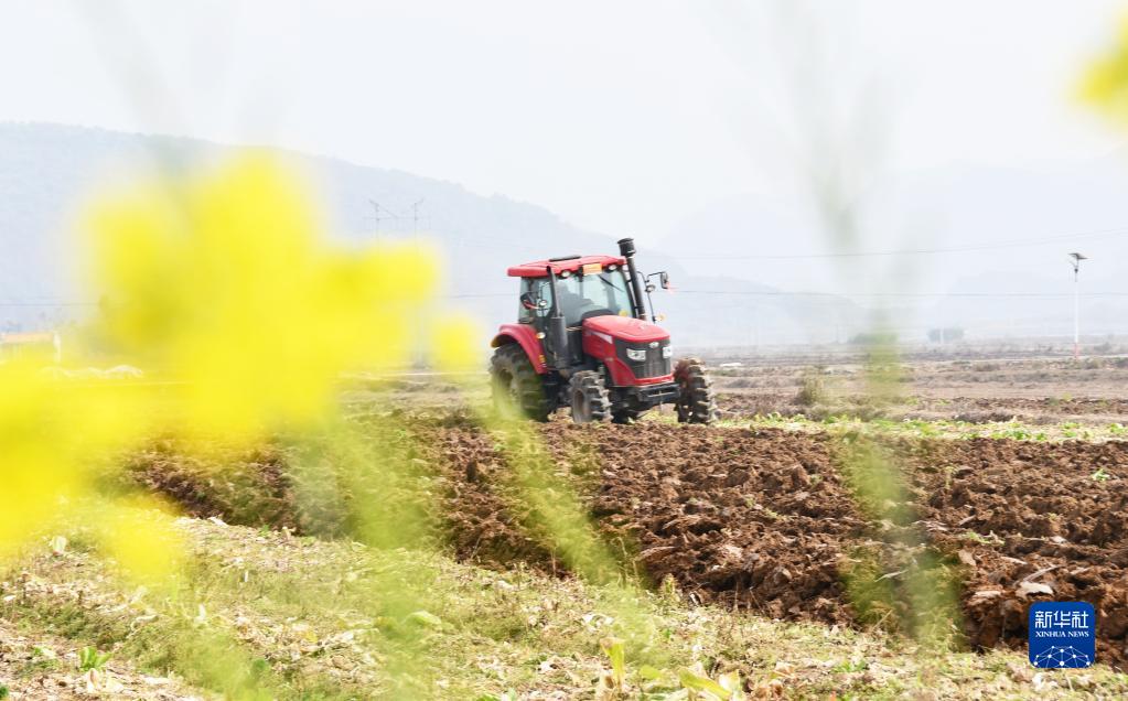 1月5日,湖南省永州市江永縣瀟浦鎮下界頭村,農民駕駛拖拉機翻耕田地。