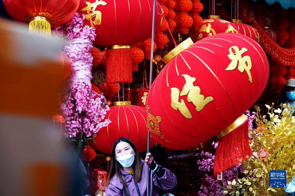 1月5日,在廣西南寧市上海路的年貨市場,銷售人員在幫顧客挑選大紅燈籠。