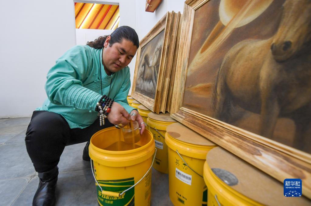 內(nèi)蒙古錫林郭勒盟正藍(lán)旗位于渾善達(dá)克沙地腹地,生活于此的80后蒙古族青年阿拉騰畢力格取沙為材,進(jìn)行沙畫藝術(shù)作品創(chuàng)作。他對(duì)渾善達(dá)克沙地中顏色各異的沙粒進(jìn)行淘洗、篩選、清理雜質(zhì)、曬干等操作后,加上用糯米汁、牛角等材料熬制而成的天然膠水,就能使各色沙粒在充分粘貼的情況下,依然保持其色彩。他的沙畫作品色彩自然、造型古樸,獨(dú)具特色。