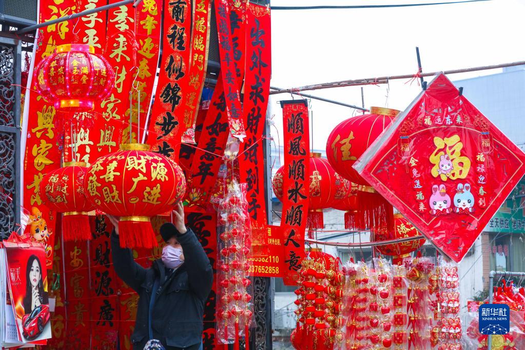 春節臨近,年味漸濃,河南省信陽市以“兔年”為主題的各種對聯、年畫、“福”字等飾品紛紛上架,成為市民搶手的熱門商品。