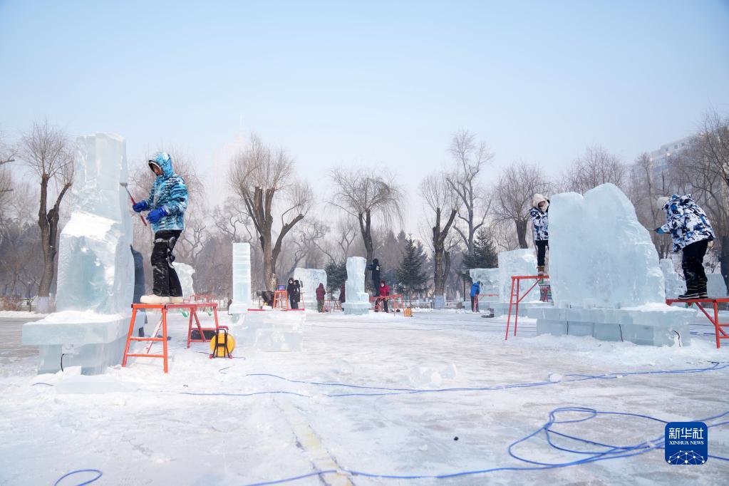 1月6日,在哈爾濱冰燈藝術游園會園區,冰雕師在進行冰雕作品創作。