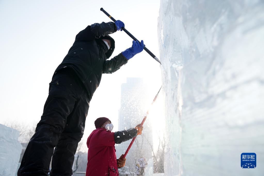 1月6日,在哈爾濱冰燈藝術(shù)游園會(huì)園區(qū),冰雕師在進(jìn)行冰雕作品創(chuàng)作。