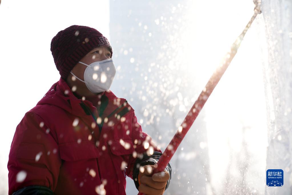 1月6日,在哈爾濱冰燈藝術游園會園區,冰雕師在進行冰雕作品創作。
