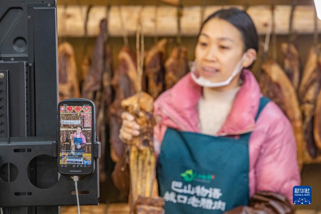 1月4日,在重慶市城口縣巴山物語電商超市,主播向直播間的觀眾展示推銷城口臘肉。