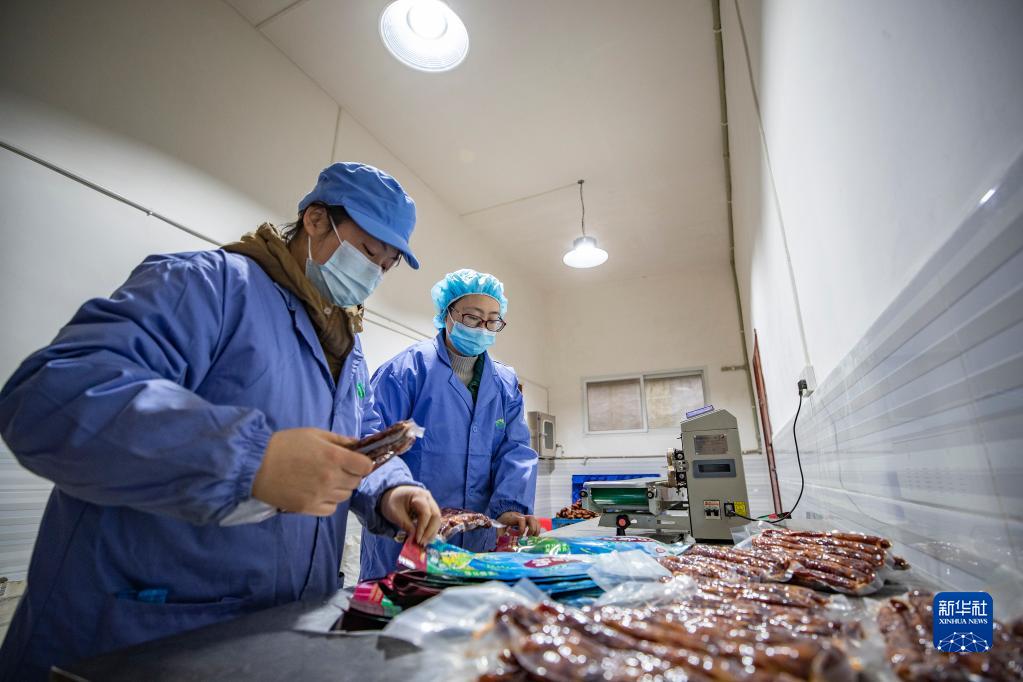 1月4日,在重慶市城口縣厚坪鄉白鶴村,重慶巴山物語食品加工有限公司的工作人員在打包即將發貨的香腸。