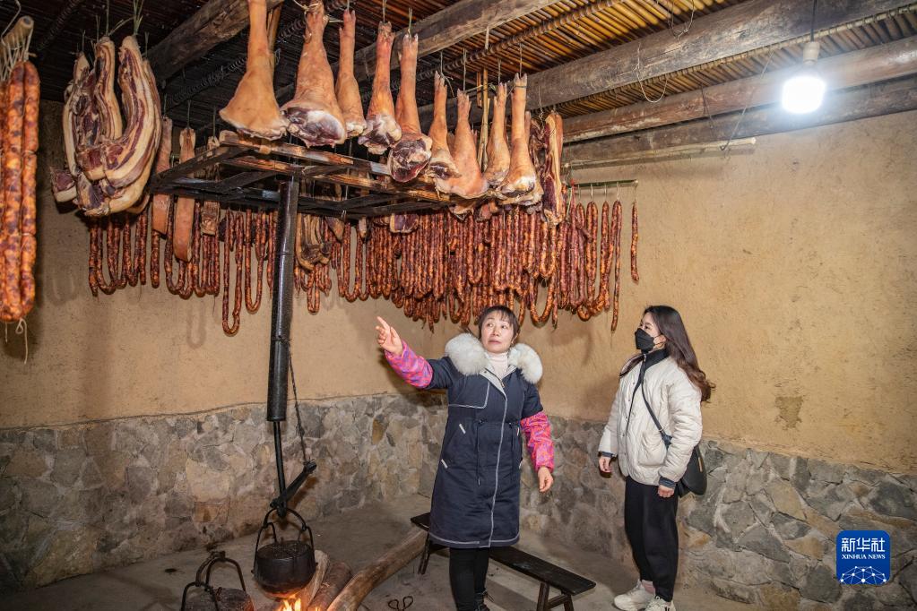 1月4日,在重慶市城口縣厚坪鄉紅色村,村民何宜香(左)向前來購買臘肉的消費者介紹正在熏制的臘肉產品。