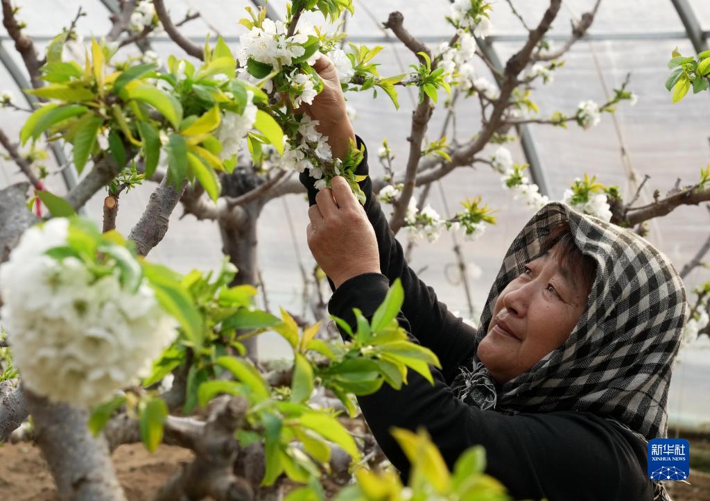 1月6日,在秦皇島市海港區海陽鎮一家櫻桃種植合作社,農民在大棚內給櫻桃樹疏花。