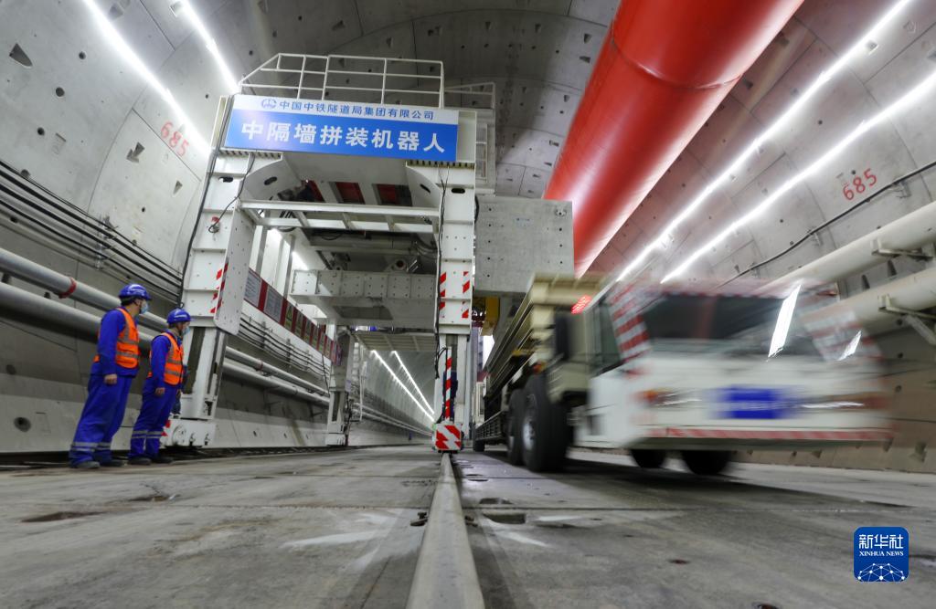 1月6日,在中鐵隧道局上海市域鐵路機場聯絡線11標項目施工現場,一輛新能源雙頭車從中隔墻拼裝機器人旁駛過。