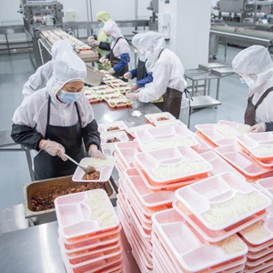位于武漢的武東餐飲基地承擔著中國鐵路武漢局集團公司管內動車組列車盒飯的制作工作。這家餐飲基地擁有現代化的動車盒飯生產線,最高可日產盒飯2萬份。