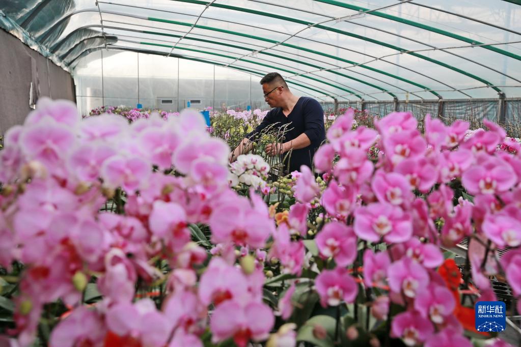 1月6日,在淮北市烈山區(qū)華家湖社區(qū)蝴蝶蘭種植基地,工作人員在溫室大棚內管理蝴蝶蘭。