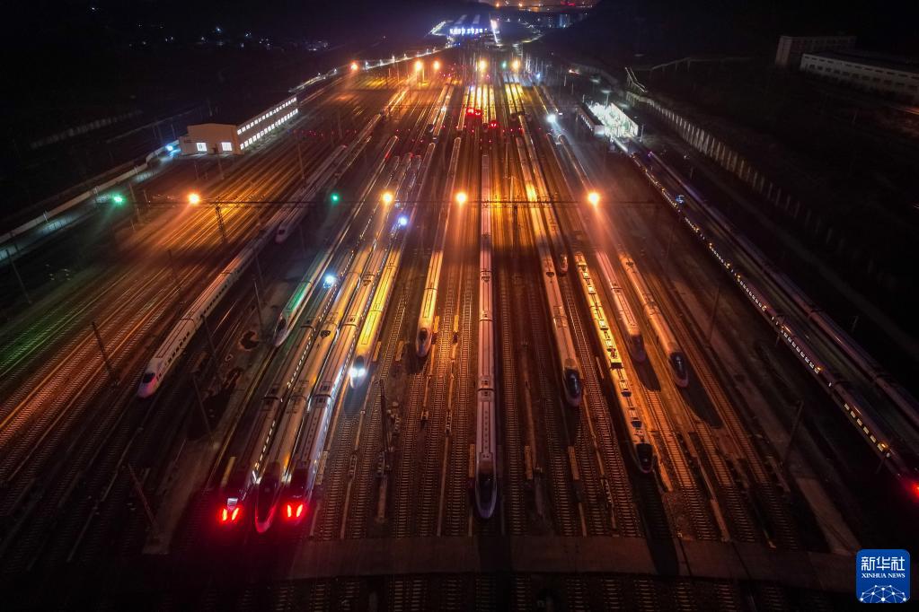 1月7日,2023年春運啟動。1月6日晚,在中國鐵路成都局集團有限公司貴陽北動車所,停靠在存車線上的動車排列整齊如同一支“陸地艦隊”。
