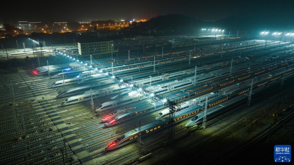 1月7日,2023年春運(yùn)啟動(dòng)。當(dāng)日凌晨,??吭诤祥L(zhǎng)沙動(dòng)車運(yùn)用所的動(dòng)車組列車排列整齊,如同一支“陸地艦隊(duì)”。