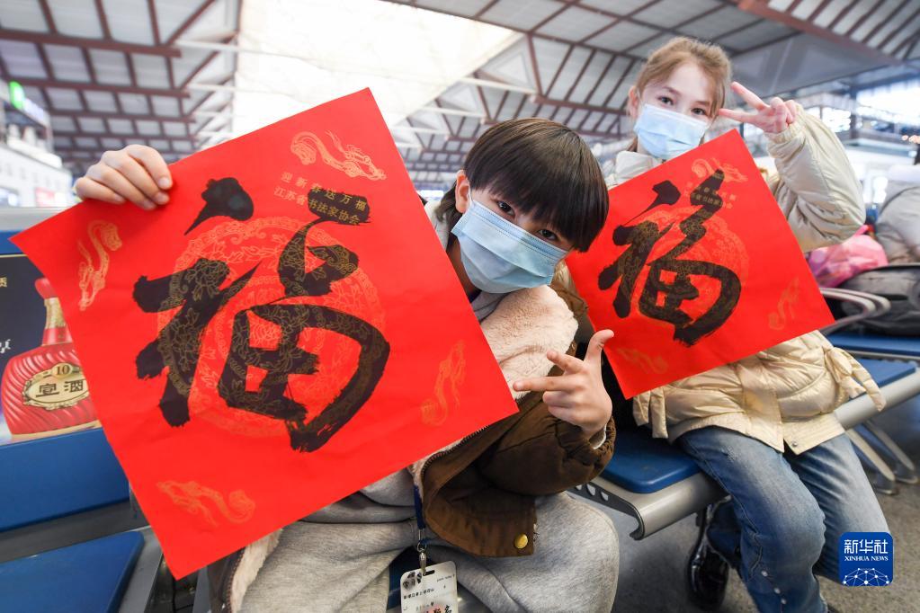 1月7日,旅客在蘇州站候車大廳展示“福”字。